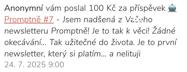 🤩 Kilo radosti. Už osm týdnů posílám každou středu newsletterovou jednohubku Promptně o tom, jak experimentuju při psaní s nástroji AI – a jak vy můžete taky. Když mi po sedmém vydání anonymně přistálo kilo na účtu i s tímhle poděkováním, fakt mi to udělalo ohromnou radost: