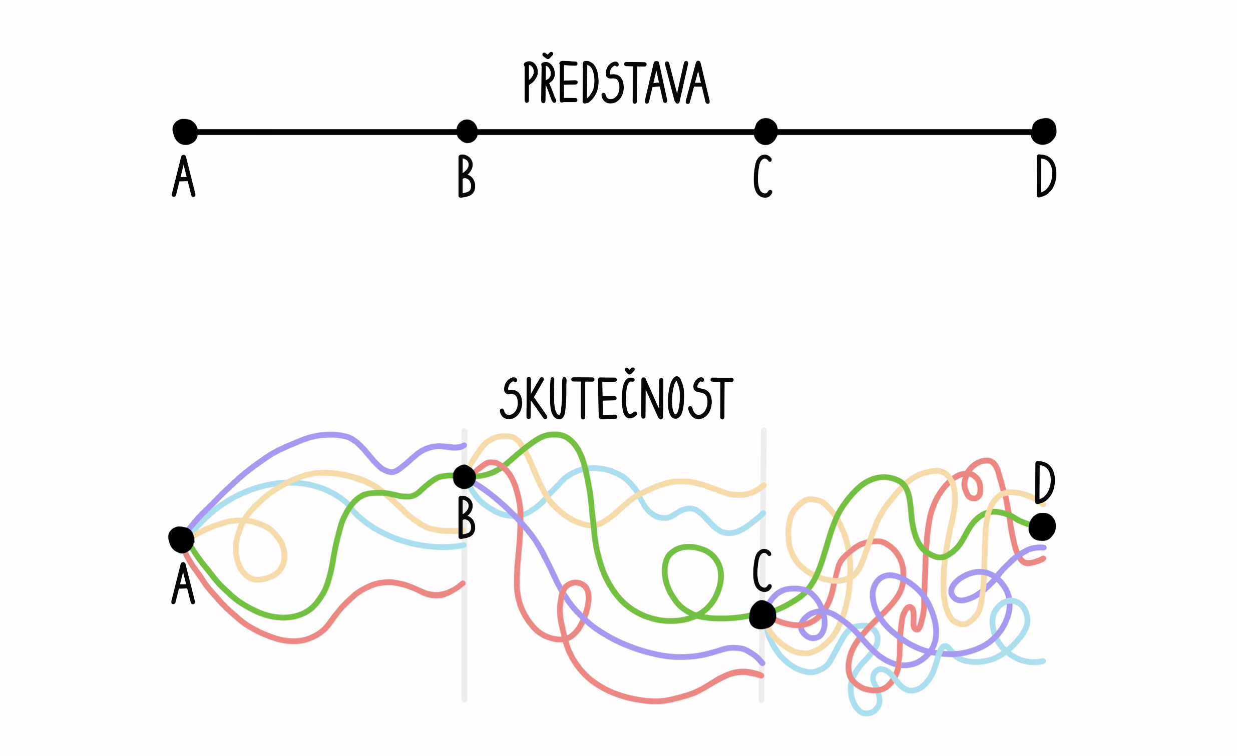 Zpětné plánování. Místo toho, abych se díval dopředu do neurčité budoucnosti, snažím se jít pozpátku od cíle. Jako bych se přenesl do bodu v budoucnosti a díval se do zpětného zrcátka na jednotlivé milníky. Je to snazší – pohled do zrcátka mi přijde o dost jasnější, pohled dopředu je jako přes zamlžené sklo.