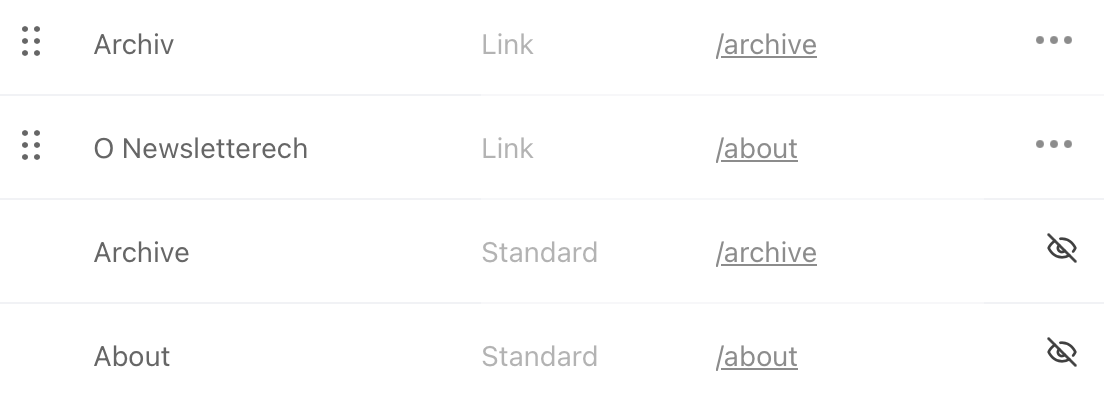 👌 Substack a čeština. Chcete mít na Substacku navigaci v češtině? Stačí v nastavení skrýt oficiální položky, jako jsou Archive nebo About, a nahradit je vlastními se stejným odkazem. (Díky za tip, Dane!)